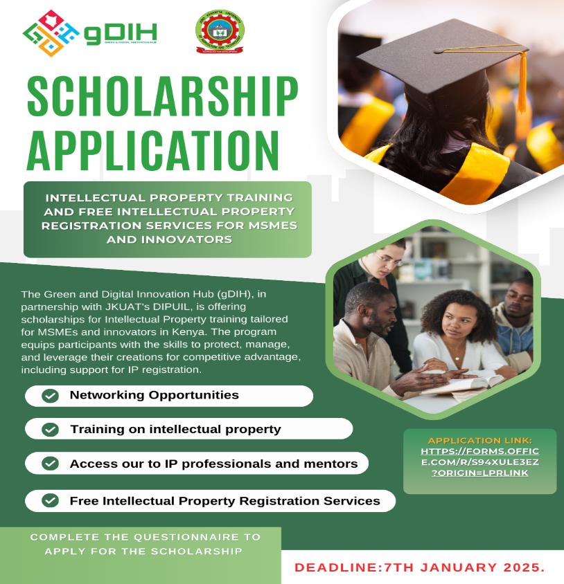 To address this gap, the Green and Digital Innovation Hub (gDIH), in partnership with Jomo Kenyatta University of Agriculture and Technology (JKUAT) – Directorate of Intellectual Property Management and University-Industry Liaison (DIPUIL) – offered a scholarship for training in Intellectual Property for MSMEs and Innovators across Kenya. This scholarship aimed to support and empower MSMEs and innovators with the knowledge and tools needed to protect their creations and drive value from their innovations. It also sought to enhance the capacity of MSMEs and innovators to understand, manage, and leverage IP for competitive advantage and provide assistance with IP registration to safeguard their innovations.